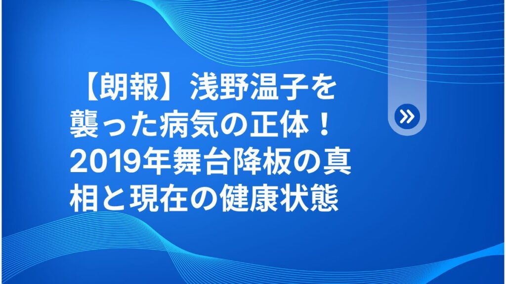 皆さん、こんにちは!トレンド探偵局の健太です。2019年、女優・浅野温子さんを突如襲った体調不良と舞台降板のニュースは、多くのファンに衝撃を与えました。あの降板…